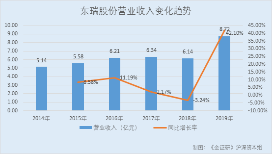2015-2019年,东瑞股份营业收入分别同比增长8.58%、11.19%、2.17%、-3.24%、42.1%,净利润分别同比增长171.83%、382.38%、-44.38%、-84.4%、3,148.76%。