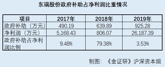 反观背后,2017-2019年的三年间,东瑞股份所获得的政府补助逐年增加,分别为490.19万元、639.89万元、925.28万元,而其2017-2019年的净利润分别为5,168.43万元、806.07万元、26,187.39万元。