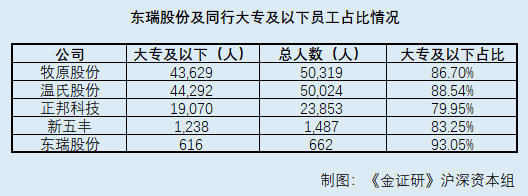 根据《金证研》沪深资本组统计,牧原股份、温氏股份、正邦科技、新五丰、东瑞股份大专及以下员工占比分别为86.7%、88.54%、79.95%、83.25%、93.05%。