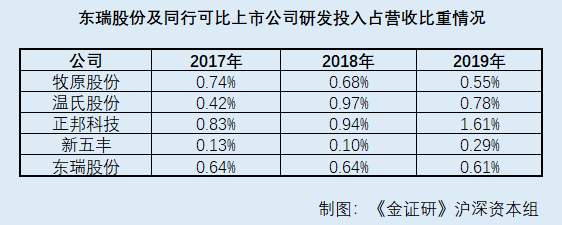 没有对比,便没有伤害。截至2019年12月31日,东瑞股份研发人员为29人,占比为4.38%。2017-2019年,东瑞股份研发费用分别为406.46万元、394.73万元、530.32万元,研发费用占营业收入的比重分别为0.64%、0.64%、0.61%。