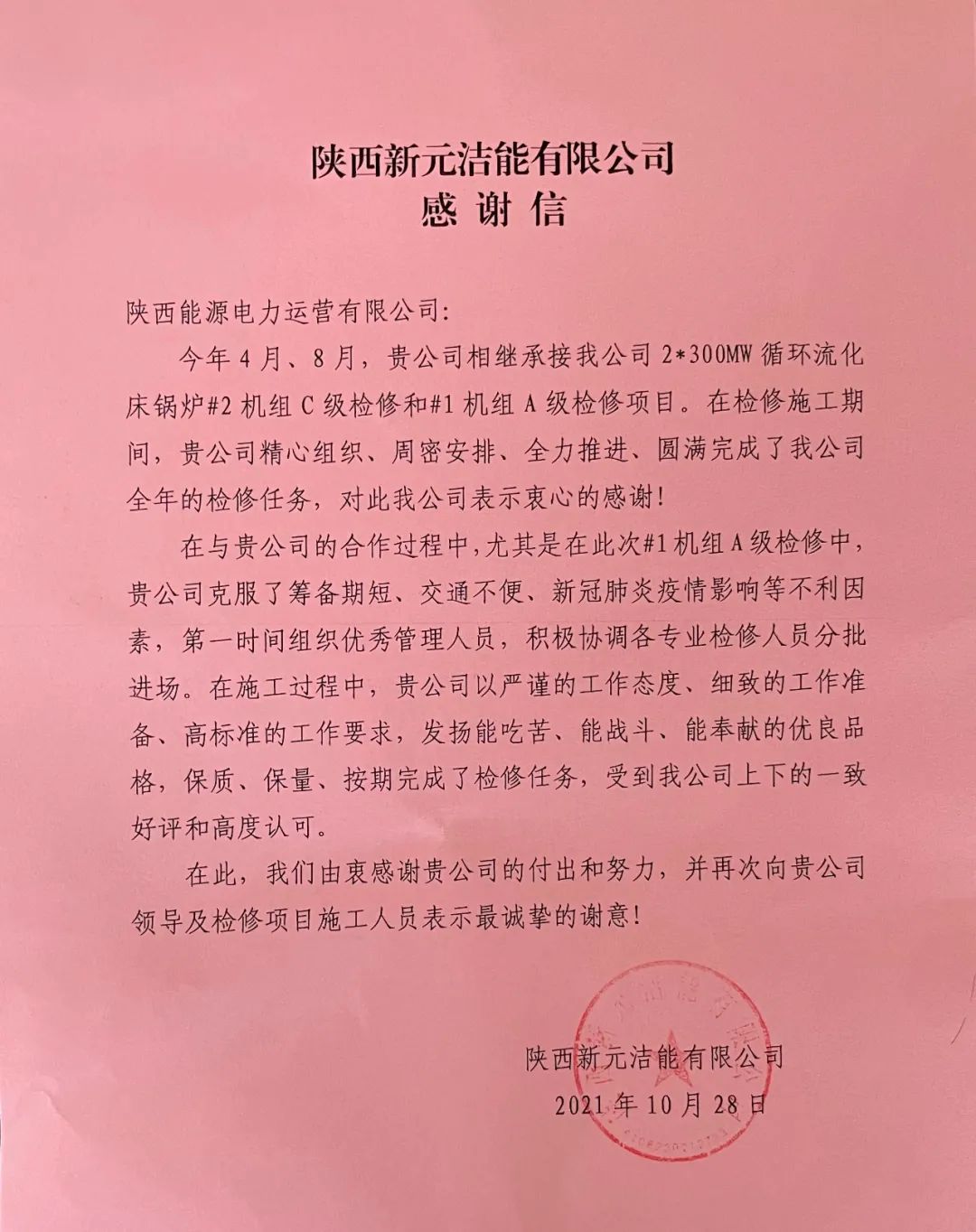 近日,电力运营收到陕煤集团陕西新元洁能有限公司的感谢信,对公司在圆满完成#2机组C级检修和#1机组A级检修项目中展现出的专业水准和顽强作风表示感谢和肯定。(周天昊)