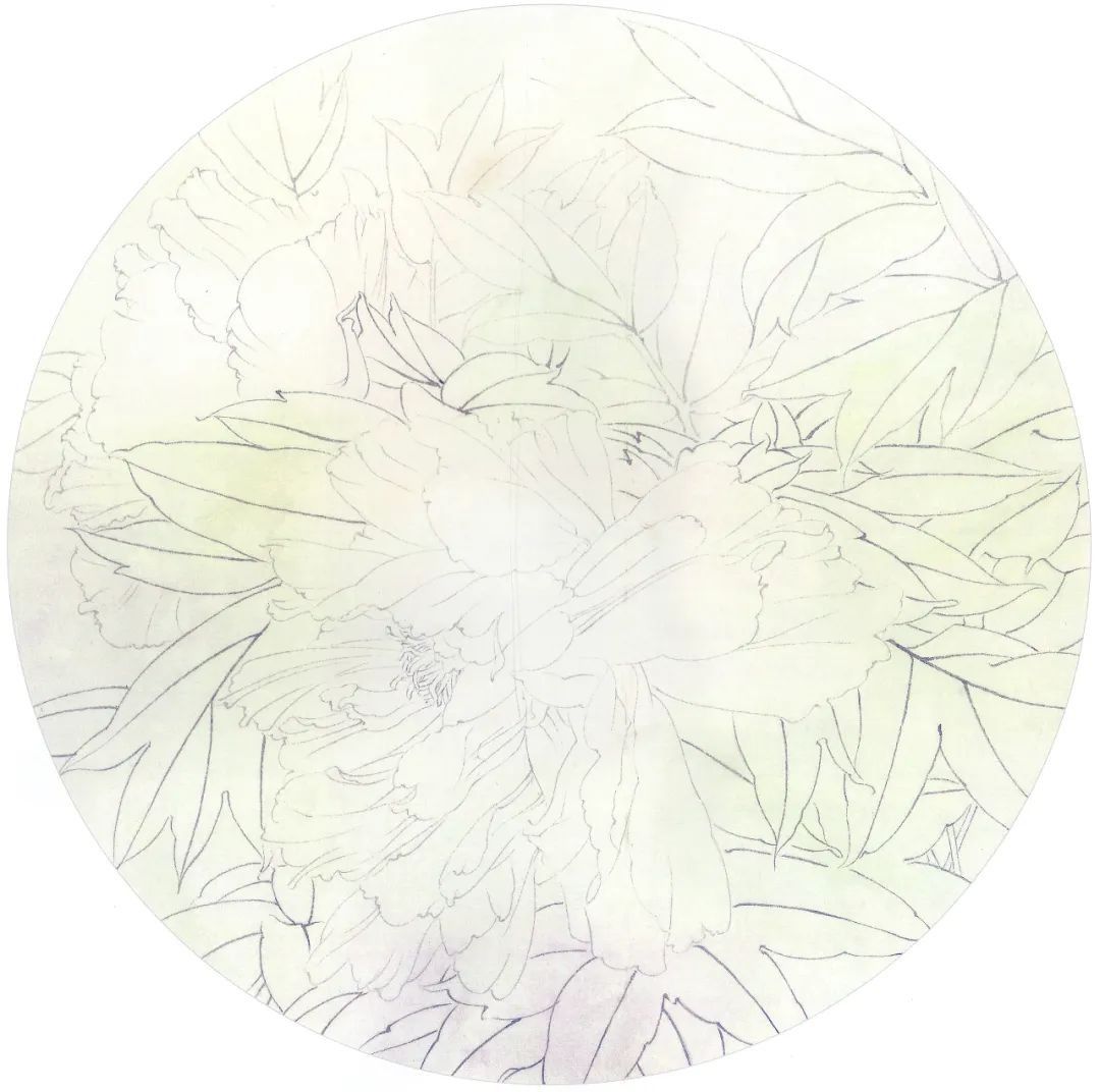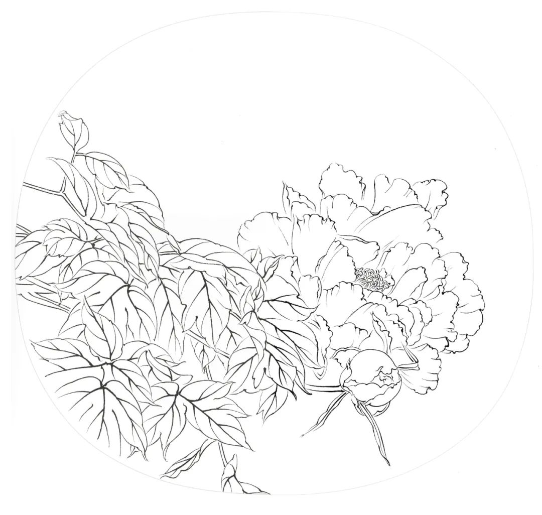 白描勾线:花头用赭墨色,叶子用墨青色。注意远处的花瓣或叶子用色较淡,以虚实营造出画面的透气感。