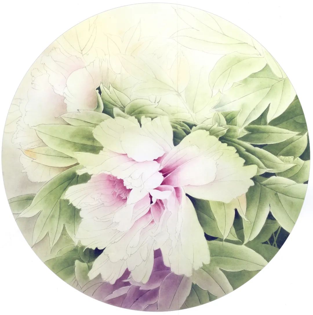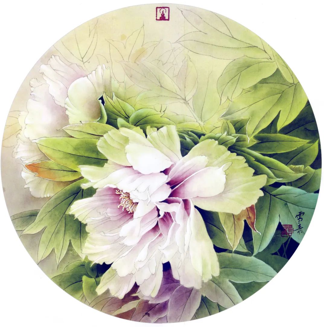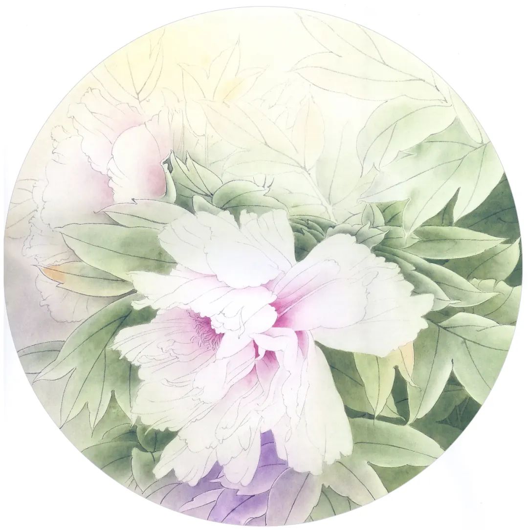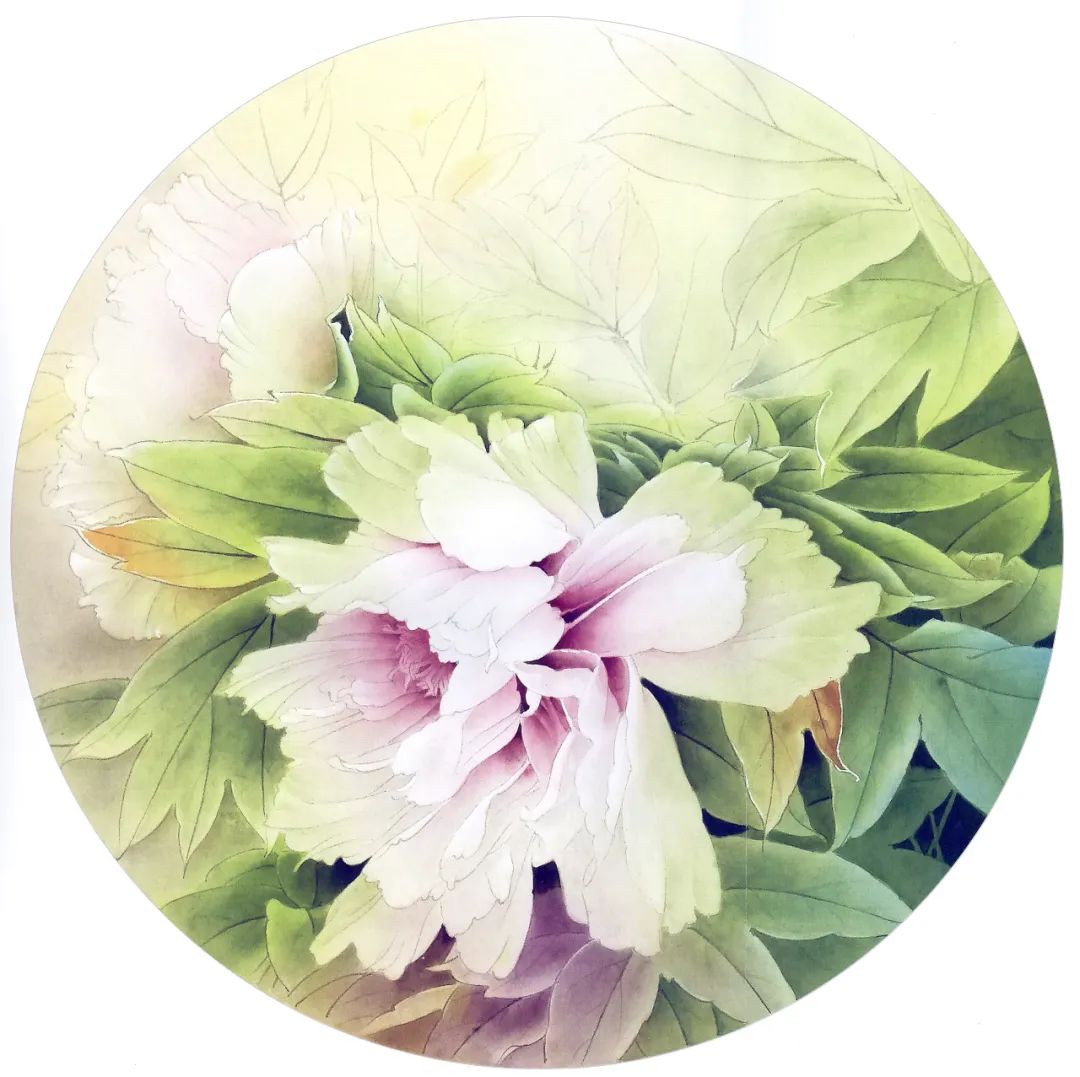 花蕊:采用双钩画法,先用藤黄加少量红色掏染暗部缝隙,然后用白粉加藤黄分染近处花蕊,远处花蕊直接立粉,再点染近处不饱和的花蕊。最后用原浓度的白粉提染前方的花蕊。花头及花蕾:反瓣用中等浓度的白粉提染受光处,正瓣用白粉点染亮处,注意正瓣用色面积要小。花蕾用白粉适当点出肌理。