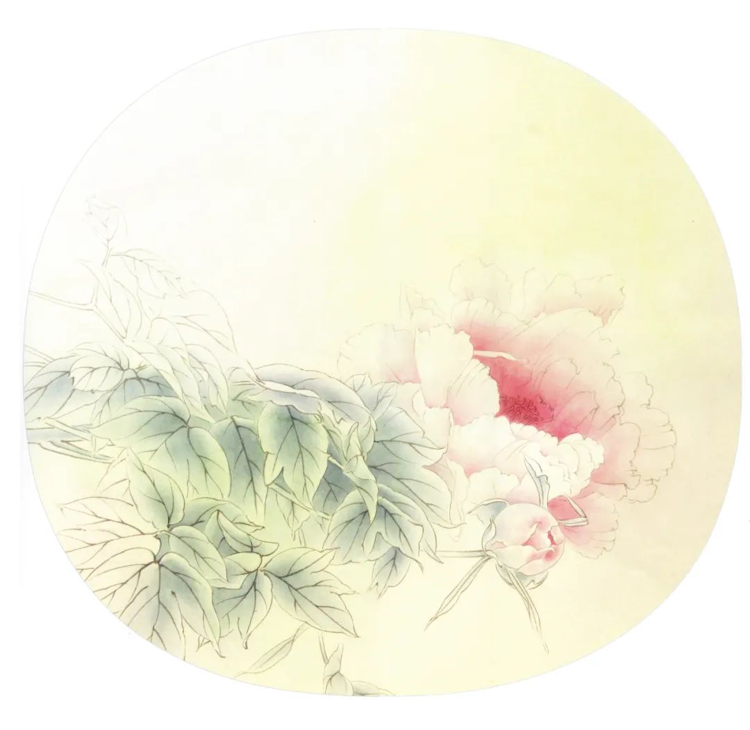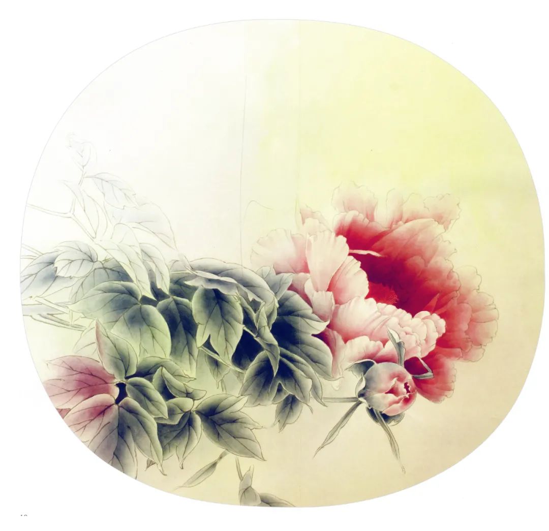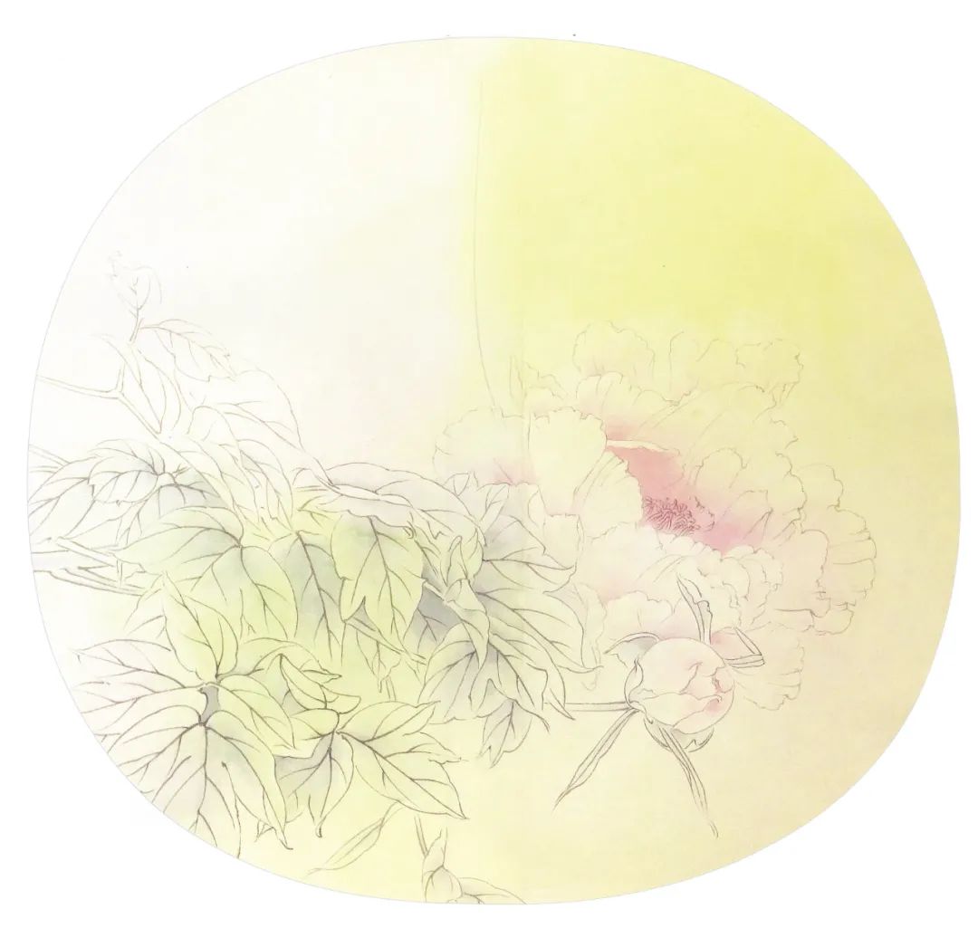 花头:用胭脂掏染花瓣的根部,直至饱和。花蕊用粉黄(白粉加藤黄)提染从花蕊的顶部往根部染,提染一次。花瓣的亮部和边缘用白粉湿染两至三次。注意上面的花瓣亮一些,下面的暗一些。花瓣边缘的褶皱要根据结构提染不可概念化