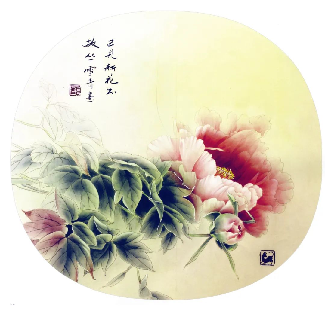 叶子:叶子的尖部和边缘用六绿(三绿加白粉和藤黄)提染。边缘再用六绿勾边缘线,呈断续状,不可勾实。枯叶用赭黄色(赭石加鹅黄和墨)点染叶筋用胭脂醒线。最后整体观察,统一调整无误后题字、钤印,完成。